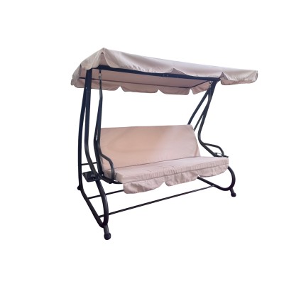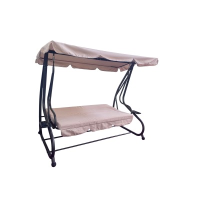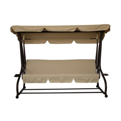 Κούνια εξωτερικού χώρου με ατσάλινο σκελετό γκρι χρώματος και αφαιρούμενο μαξιλάρι καθίσματος και πλάτης, από μπεζ πολυεστέρα. Κατάλληλο για 3 άτομα, ιδανικό για τοποθέτηση στον κήπο ή τη βεράντα. Διαθέτει ανακλινόμενη οροφή, αφαιρούμενο κάλυμμα μαξιλαριού (για εύκολο καθάρισμα), θήκη ποτών και ανακλινόμενη πλάτη 2 θέσεων. Το κάθισμα μπορεί να μετατραπεί σε άνετο κρεβάτι για 2 άτομα, πρακτικό και άνετο. Κατασκευασμένο με ανθεκτικά υλικά και αφαιρούμενα μαξιλάρια για ευκολότερη συντήρηση. Υποστηρίζει έως 180 κιλά. Διαστάσεις: 200 x 120 x 164 cm (πλάτος x βάθος x ύψος). Για συντήρηση, συνιστούμε να το αποθηκεύετε σε εσωτερικό χώρο, μακριά από το άμεσο ηλιακό φως και να το αποθηκεύετε σε στεγνό και αεριζόμενο μέρος όταν δεν χρησιμοποιείται (ή να το καλύπτετε με κάλυμμα επίπλων).