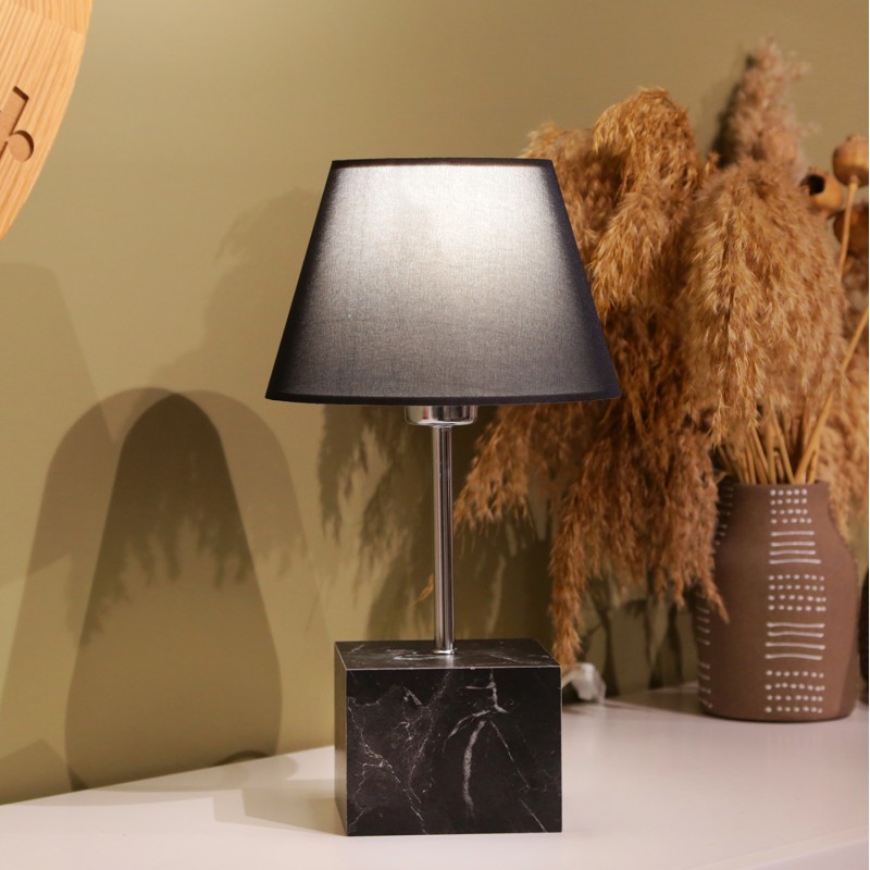 Επιτραπέζιο διακοσμητικό φωτιστικό με μονή κολώνα. Η βάση του φωτιστικού έχει το σχήμα κύβου με όψη ανθρακί μαρμάρου ενώ η κολώνα είναι σε χρυσό χρώμα. Το «καπέλο» έχει τραπεζοειδές κυκλικό σχήμα σε μαύρο χρώμα. Το φως διαχέεται στον χώρο ευχάριστα και η αντανάκλασή του πάνω στην χρυσή κολωνίτσα του φωτιστικού αλλά και στην κυβική βάση, παιχνιδίζει ευχάριστα στο μάτι. Αυτού του είδους τα φωτιστικά δεν προορίζονται για φωτιστικά διαβάσματος και αυτό πρέπει πάντα να λαμβάνεται υπόψη κατά την επιλογή τους. Είναι καθαρά διακοσμητικά και το ταίριασμά τους με τον περιβάλλοντα χώρο θα πρέπει να είναι αρμονικό. Αυτό το φωτιστικό είναι κομψό και βολικό σε διαστάσεις παρέχοντας αμέτρητες δυνατότητες «δεσίματος» με την υπόλοιπη διακόσμησή σας. Είναι ένα μικρό έργο τέχνης.