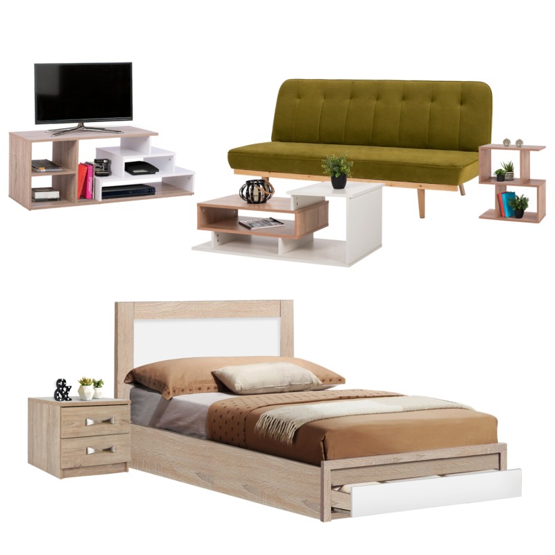 Αυτό το σετ περιλαμβάνει κρεβάτι, κομοδίνο, καναπέ, τραπέζι σαλονιού, βοηθητικό τραπεζακι, και έπιπλο TV