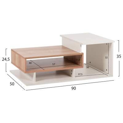 - Τραπέζι σαλονιού από μελαμίνη με ράφι και από τις δύο πλευρές του τραπεζιού σε διχρωμία Φυσικό - Λευκό.