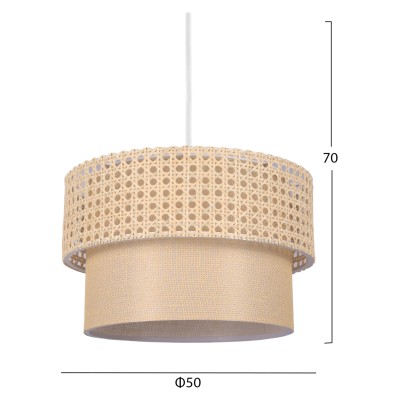 ΠΛΕΟΝΕΚΤΗΜΑΤΑ: Η αισθητική υπεροχή αυτού του φωτιστικού θα το κάνει να ξεχωρίζει στον χώρο σας γιατί έχει μια απλοϊκή αλλά καλλιτεχνική εμφάνιση. Ο μεταλλικός του σκελετός είναι άψογα κατασκευασμένος ενώ το τύμπανο έχει δύο δακτυλίους. Ο εξωτερικός δακτύλιος είναι κατασκευασμένος από μπεζ rattan πλέξη, ενώ το εσωτερικό από ύφασμα στο χρώμα της μπεζ άμμου. Το αποτέλεσμα είναι εξαιρετικά κομψό σε εμφάνιση. Καταφέρνει να συνδυάσει μια ελκυστική μοντέρνα γοητεία με το ιδανικό μέγεθος, προσθέτοντας έτσι μια όμορφη διακόσμηση στην οροφή σας. Το ρυθμιζόμενο ύψος του μπορεί να προσφέρει διαφορετικά επίπεδα φωτεινότητας και οπτικής απόλαυσης. Εκτός από διάφορα δωμάτια του σπιτιού σας, μπορεί, επίσης, να ταιριάξει και σε επαγγελματικούς χώρους όπως εστιατόρια, καφέ, ξενοδοχεία κτλ. Η εντύπωση της μονοχρωμίας του φωτιστικού και το design αιχμαλωτίζει τα βλέμματα, αλλά ταυτόχρονα απαιτεί και ιδιαίτερη διακοσμητική συνοχή για να αναδείξει πλήρως τις αισθητικές αρετές του.