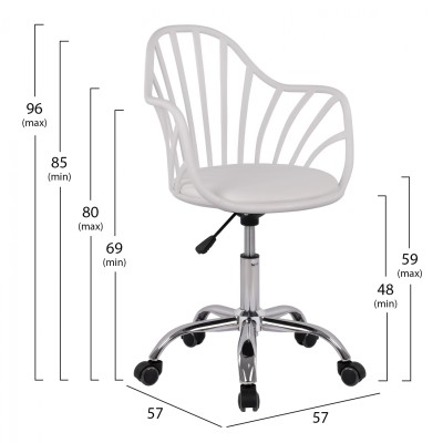 Σας παρουσιάζουμε την “BECKY”. Μια καρέκλα γραφείου σε λευκό χρώμα, λιτή και ταυτόχρονα λειτουργική που θα ικανοποιήσει τόσο τον μαθητή στο σπίτι, όσο και πολλούς επαγγελματίες. Το design της είναι απλό, με το κάθισμα να είναι στρογγυλό χωρίς βαθύ «μαξιλάρι» και η μεσαίου ύψους πλάτη με τα μπράτσα να αποτελούν μια ενιαία κατασκευή με κάθετες ακτίνες αγκαλιάζοντας το σώμα. Η ανάρτηση προσφέρει ρύθμιση ύψους μέσω ενός μεταλλικού μοχλού, ενώ η χρωμιωμένη αστεροειδής βάση με τους μαύρους τροχίσκους ολοκληρώνει την πανέμορφη αυτή υλοποίηση.