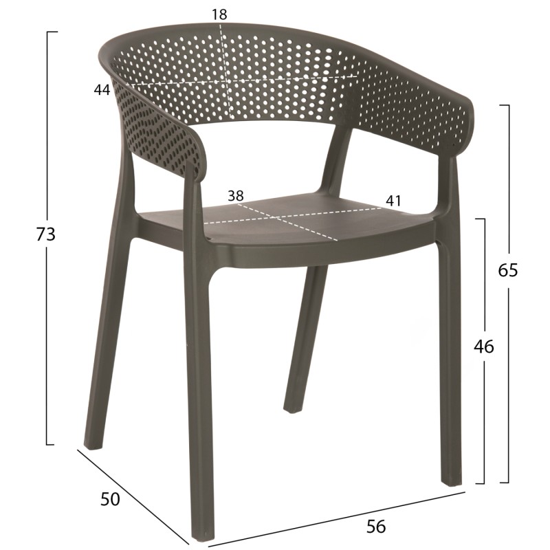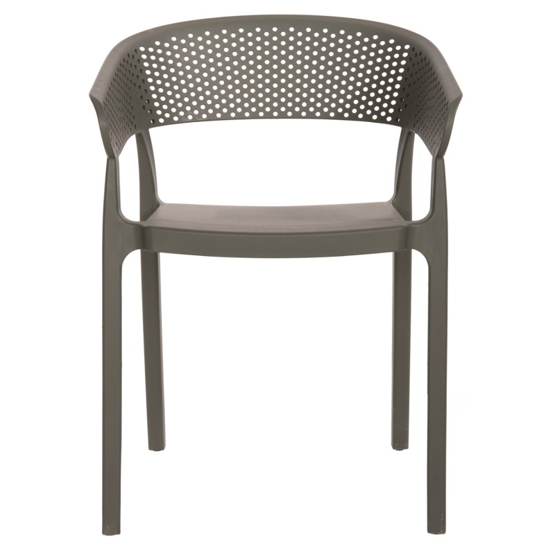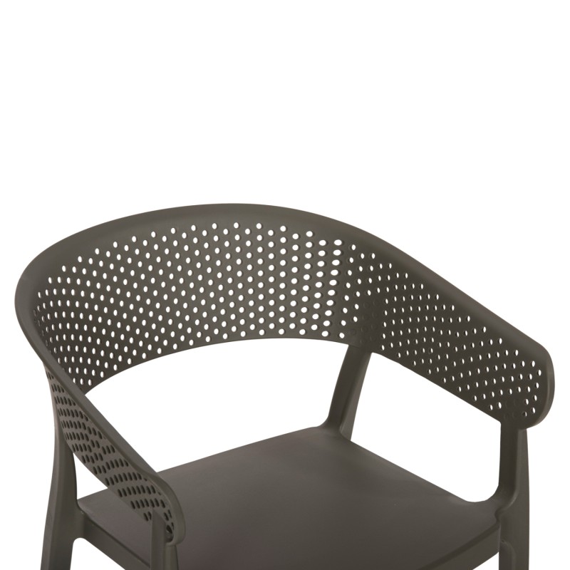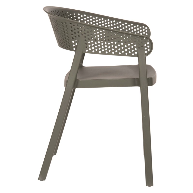 Πολυθρόνα πολυπροπυλενίου σε DARK OLIVE χρώμα. Ιδανική πρόταση για χρήση σε εξωτερικούς χώρους, είτε επαγγελματικούς (χώροι δεξιώσεων, εταιρείες catering, κλπ.) είτε για το σπίτι. Η πολυθρόνα αποτελείται από ένα λείο κάθισμα και μια ημικυκλική, ανεξάρτητη και «τρυπητή» πλάτη και μπράτσα. Είναι πανέμορφη και θα αναβαθμίσει αισθητικά κάθε εξωτερικό χώρο.