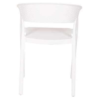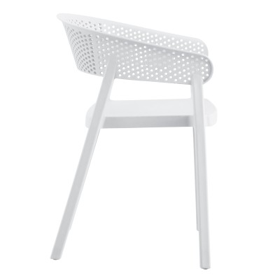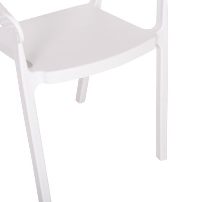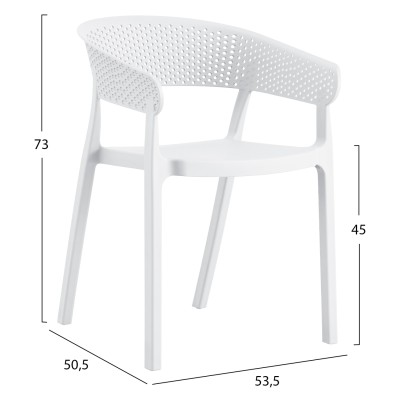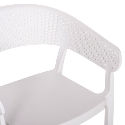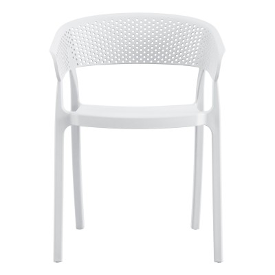 Πολυθρόνα πολυπροπυλενίου σε ΛΕΥΚΟ χρώμα. Ιδανική πρόταση για χρήση σε εξωτερικούς χώρους, είτε επαγγελματικούς (χώροι δεξιώσεων, εταιρείες catering, κλπ.) είτε για το σπίτι. Η πολυθρόνα αποτελείται από ένα λείο κάθισμα και μια ημικυκλική, ανεξάρτητη και «τρυπητή» πλάτη και μπράτσα. Είναι πανέμορφη και θα αναβαθμίσει αισθητικά κάθε εξωτερικό χώρο.