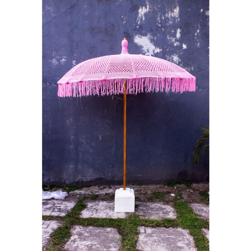 Η ομπρέλα πολυτελείας ΗΜ6035.04 είναι πραγματικά πανέμορφη. Ο στύλος της είναι από μασίφ ξύλο ΤΕΑΚ ενώ τα «μπράτσα» της ομπρέλας είναι από ξύλο BAMBOO. Το ιδιαίτερο χαρακτηριστικό, όμως, αυτής της εκπληκτικής ομπρέλας είναι ότι το σκίαστρό της είναι φτιαγμένο από μακραμέ σε ΡΟΖ χρώμα. Μια ομπρέλα που μπορεί να χρησιμοποιηθεί με πολλούς τρόπους κυρίως σε επαγγελματικούς χώρους και να προσφέρει με τις διαστάσεις της σκίαση με στυλ!