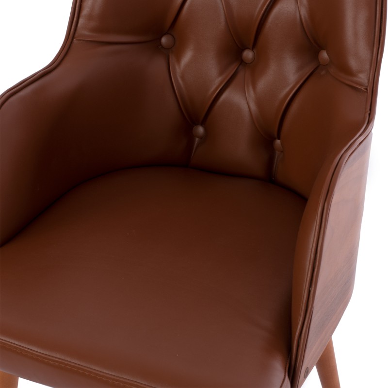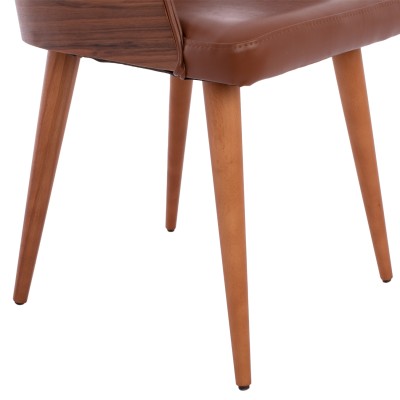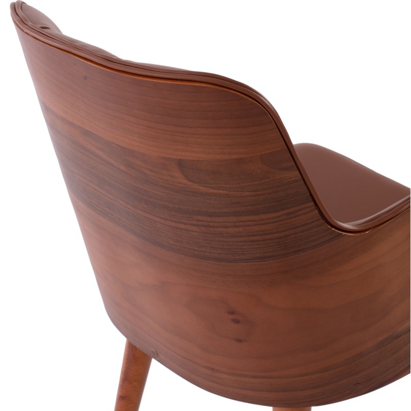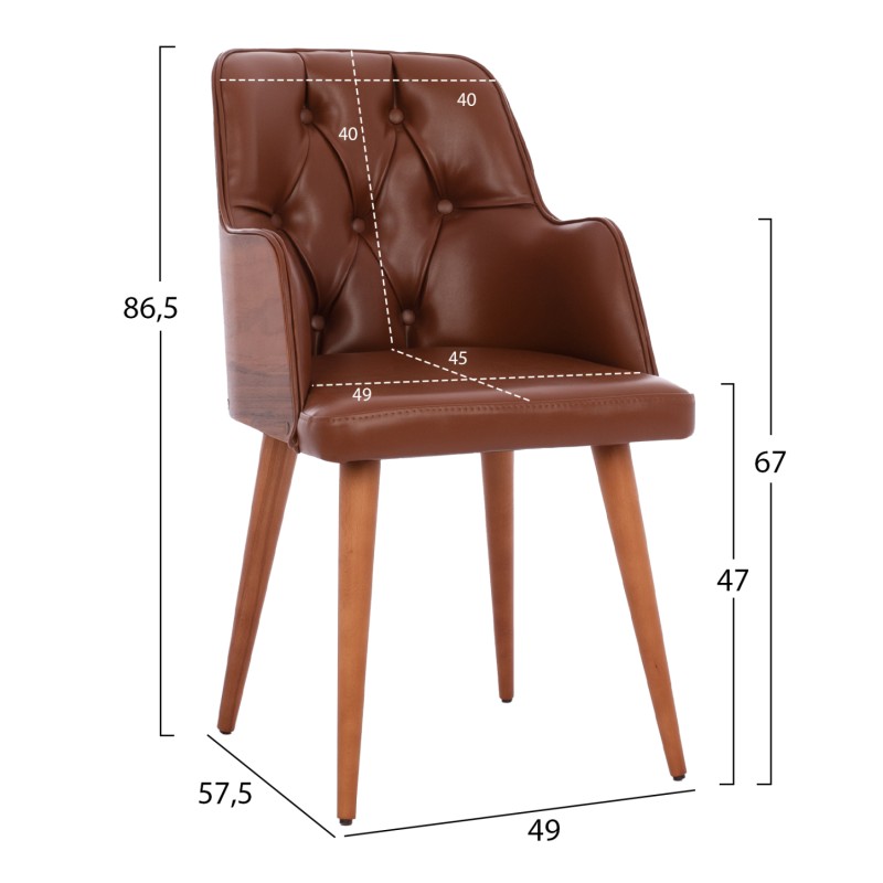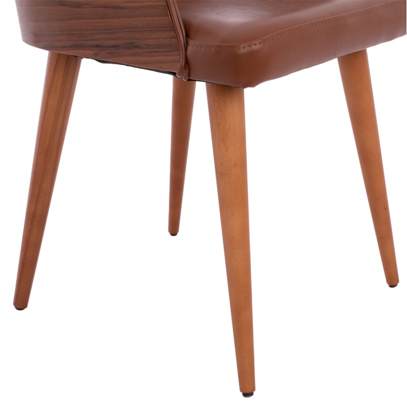 Πολυθρόνα ESTRELLA σε ταμπά απόχρωση με ξύλινη πλάτη, και ξύλινα πόδια σε καρυδί απόχρωση. Η ξύλινη πλάτη είναι συμπαγής και το ξύλο φτάνει κυρτά και συνεχόμενα μέχρι τα μισά του καθίσματος σχηματίζοντας τα μπράτσα της καρέκλας.
